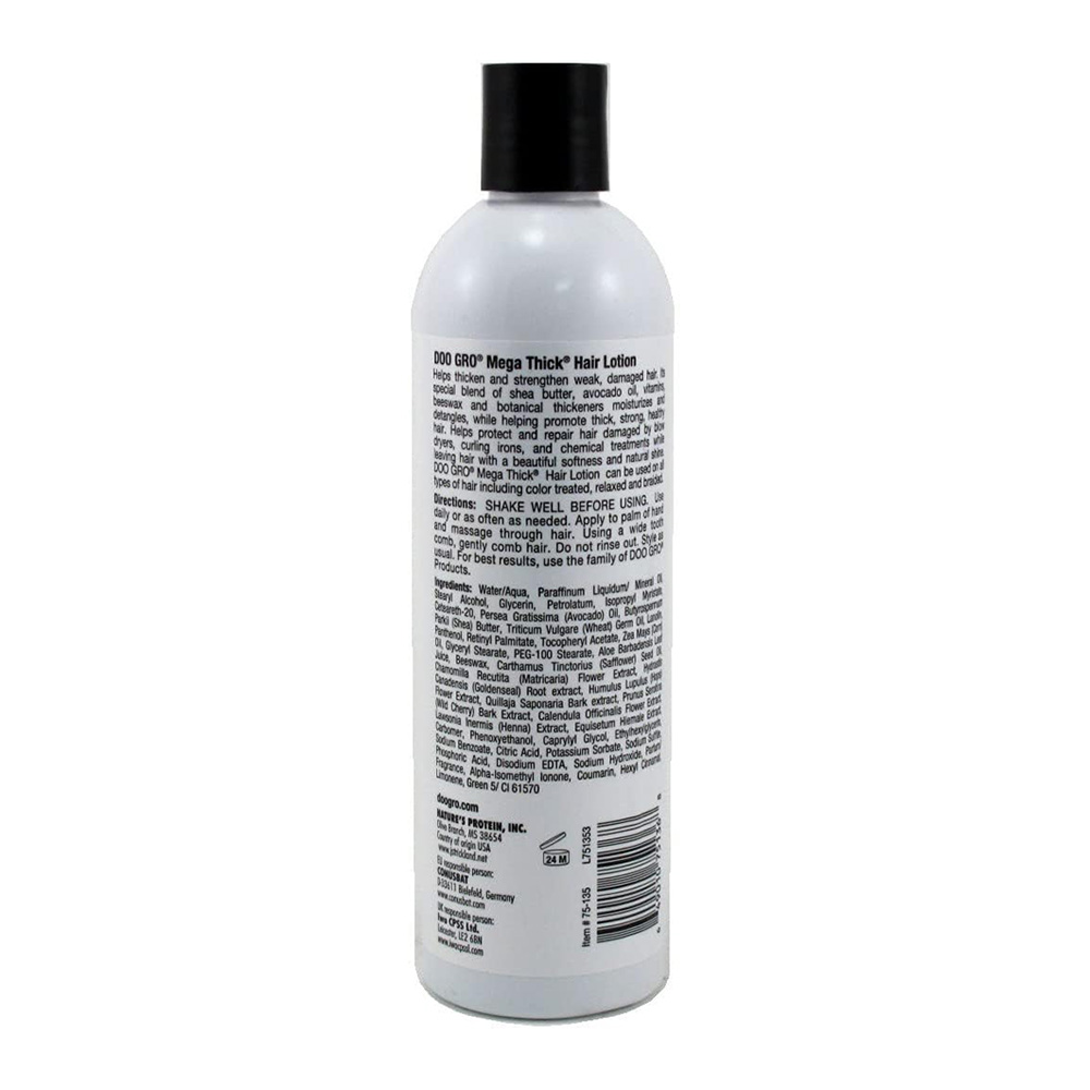 Helps stop breakage and repairs weak, damaged hair. Its special blend of aloe vera, shea butter, vitamins, beeswax and herbal extracts moisturizes and detangles, while helping promote strong, healthy hair. Helps protect hair from the damaging effects of blow dryers, curling irons, and chemical treatments while leaving hair with a beautiful softness and natural shine. DOO GRO® Triple Strength Hair Lotion Anti-Breakage Formula can be used on all types of hair including color treated, relaxed and braided